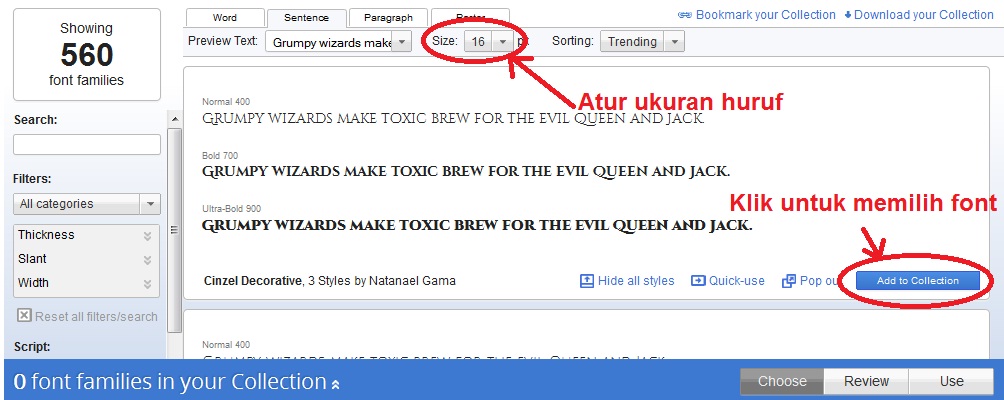- Jika anda sudah menemukan huruf-huruf yang anda sukai tinggal klik ADD TO COLLECTION pada bagian kanan bawah sampel huruf. Silahkan pilih lebih dari satu huruf jika diperlukan